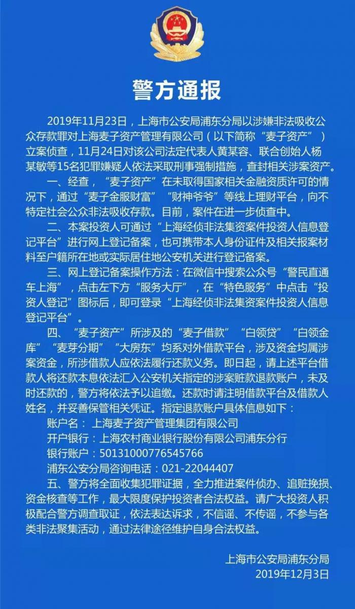此外,对于借款人,警方要求,“麦子资产”所涉及的“麦子借款”、“白领货”、“白领金库”、“麦芽分期”、“大房东”均系对外借款平台,涉及资金均属涉案资金,所涉借款人应依法履行还款义务。即日起,请上述平台借款人将还款本息依法汇入公安机关指定的涉案赃款退款账户,未及时还款的,警方将依法予以追缴。