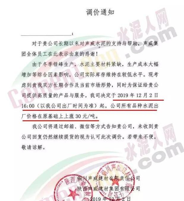 券商中国记者从水泥人网了解到,12月2日,陕西省多家水泥主导企业发布涨价通知,包括声威建材、冀东水泥、尧柏水泥等。