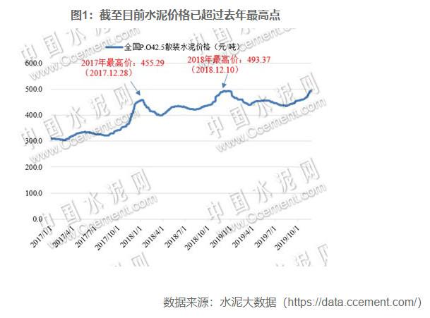 水泥大数据研究院魏瑜指出,8月下旬开始,随着旺季的来临,水泥价格一路上涨。截至11月25日全国P.O42.5散装水泥价格为495.31元/吨,超过2018年的最高点,也创造了2011年以来的最高点。