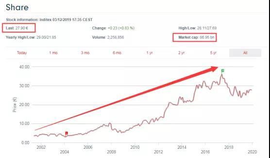 而inditex集团则自上市以来,股价一路上涨。最新数据显示,目前一股27.9欧元。