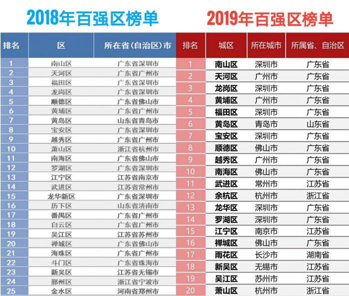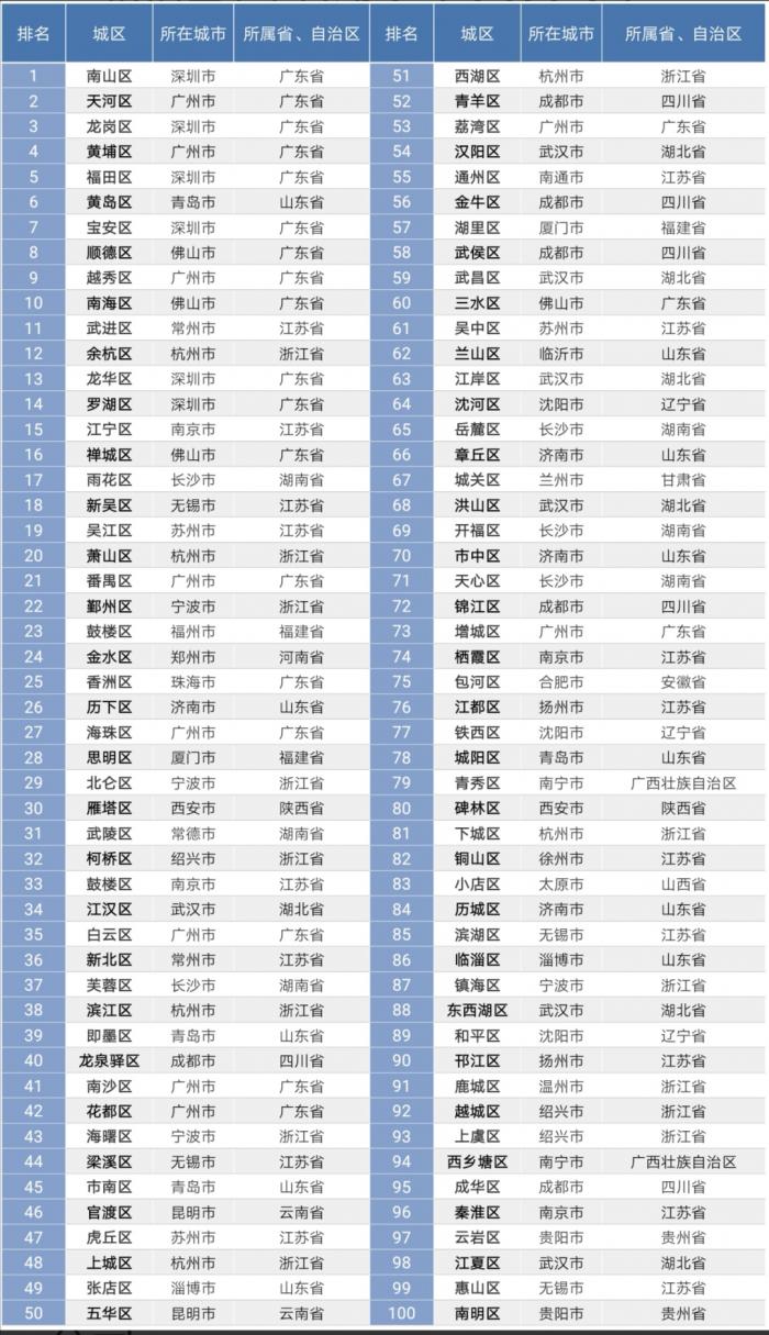 百强区前十名中,广东一省独占9席,前5名更是由广东独揽,分别为深圳南山区、广州天河区、深圳龙岗区、广州黄埔区、深圳福田区。