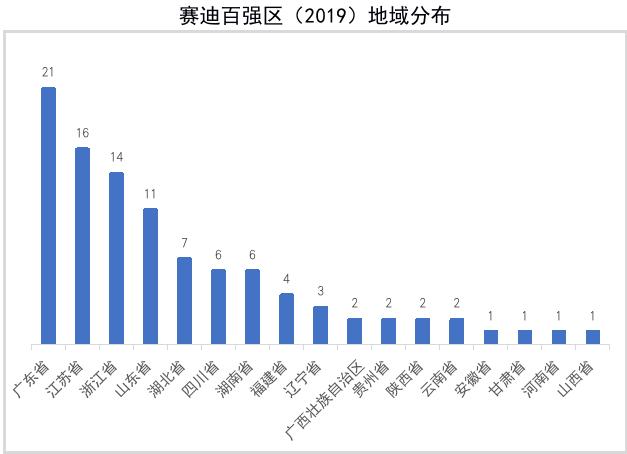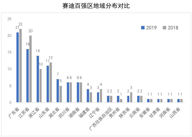 在2019年百强区前二十名中,广东省独占12席、江苏省占4席、浙江省占2席,山东省及湖南省各占1席。