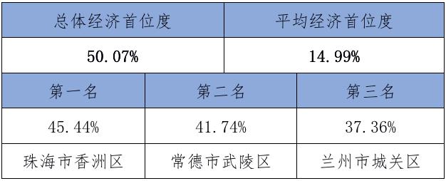 百强区分布在34个城市中,强市强区特点明显,总体地区首位度(城区生产总值占城市生产总值比重)达50.07%,平均首位度为14.99%,是推动所在城市经济发展的中坚力量。
