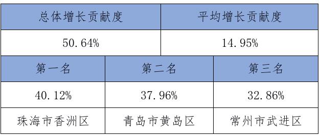 研究认为,贡献度能较为直观的反映城区对增量的拉动作用、上升潜力及创新水平。百强区综合地区贡献度为50.64%,所处城市生产总值增量中,百强区贡献超过半数,平均地区贡献度达到14.95%。