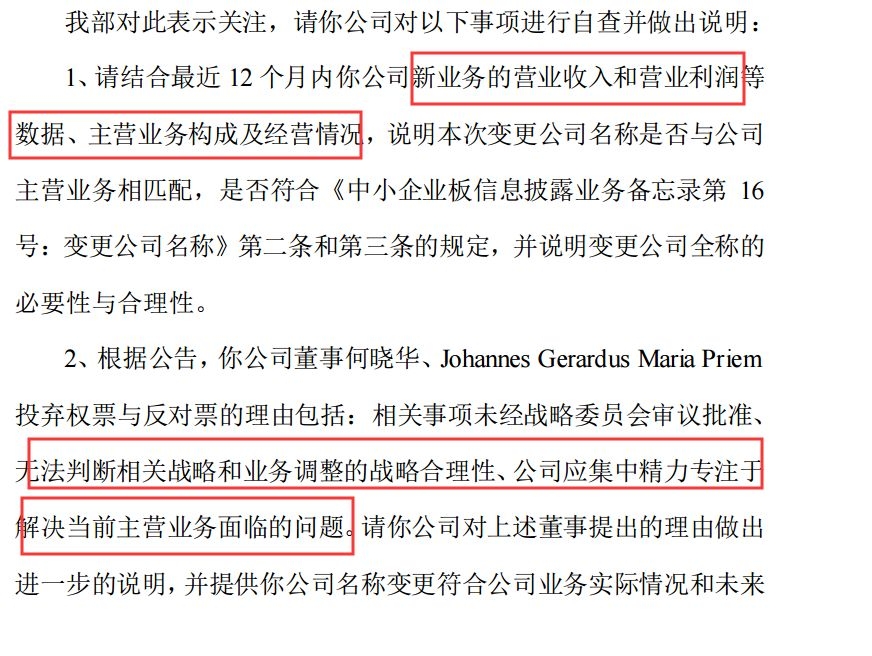 深交所对贝因美的问询函中,要求指出“过去12个月内新业务的营业收入及利润等数据”,贝因美则在回复函中称,公司更名是为了战略调整,公司原有主营业务依然在未来主营业务的范围内。