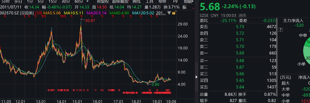 贝因美的股价在2013年到达高点后,至今已经跌去接近7成。