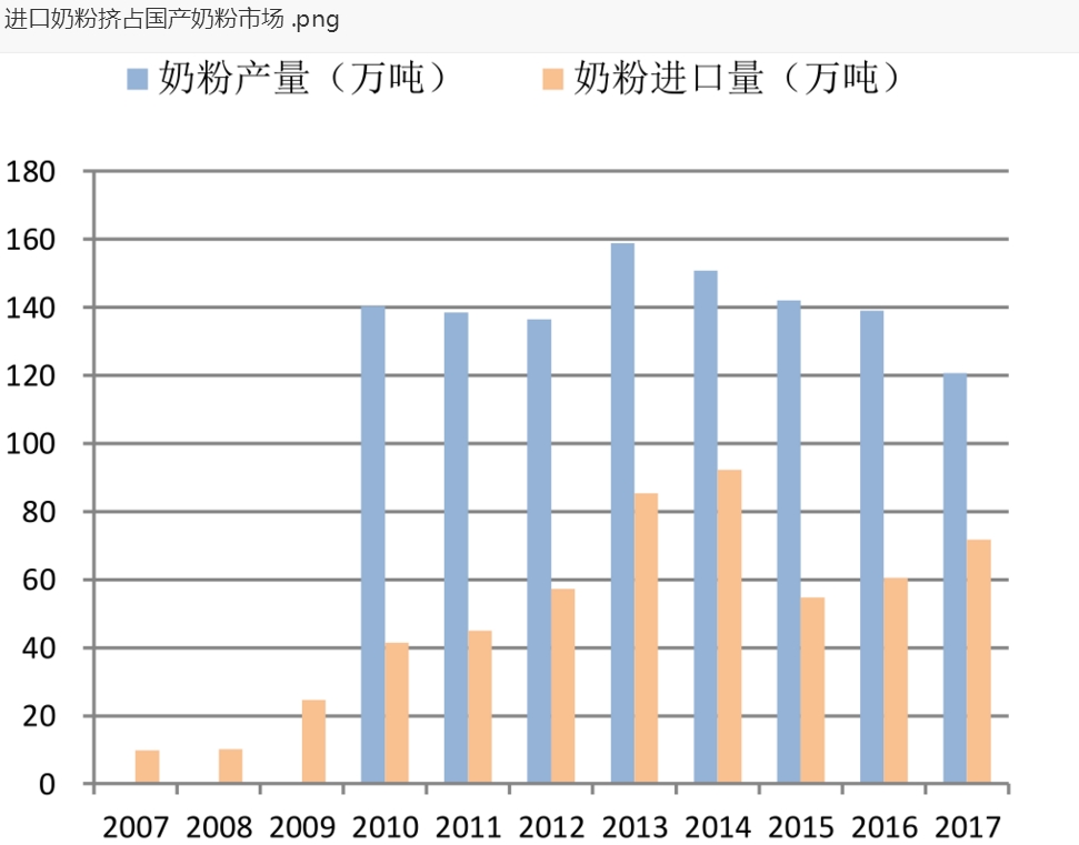 2017年和2018年,国产奶粉消费量甚至出现负增长。