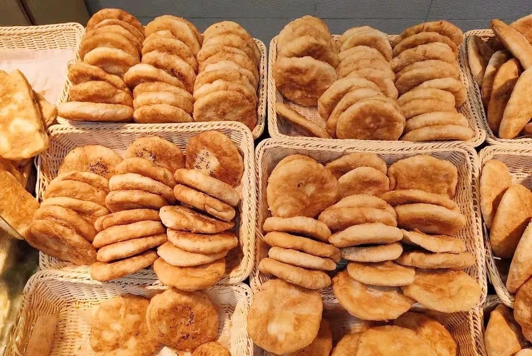 还有绝对找不到两家一模一样的烧饼。同样酥皮的烧饼,超市比小摊上更规整一些,还有青椒口味。