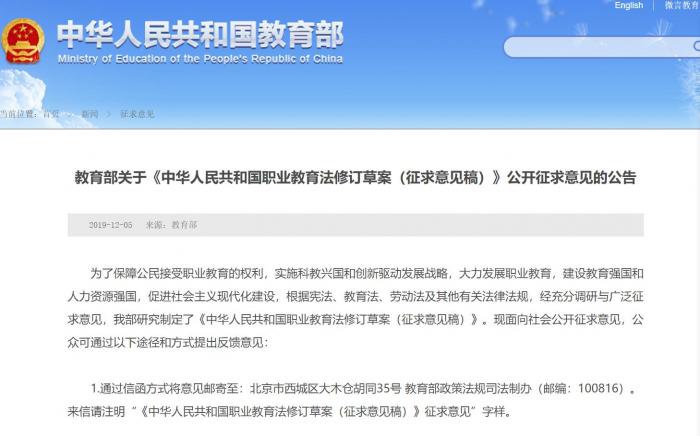 12月5日,教育部网站发布《中华人民共和国职业教育法修订草案(征求意见稿)》,公开征求意见。