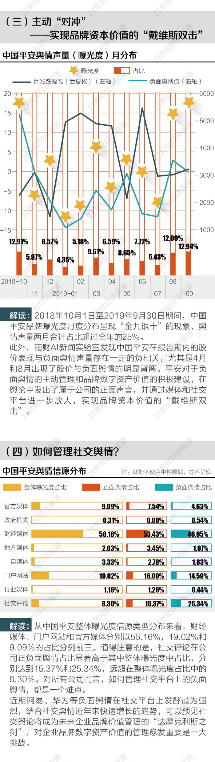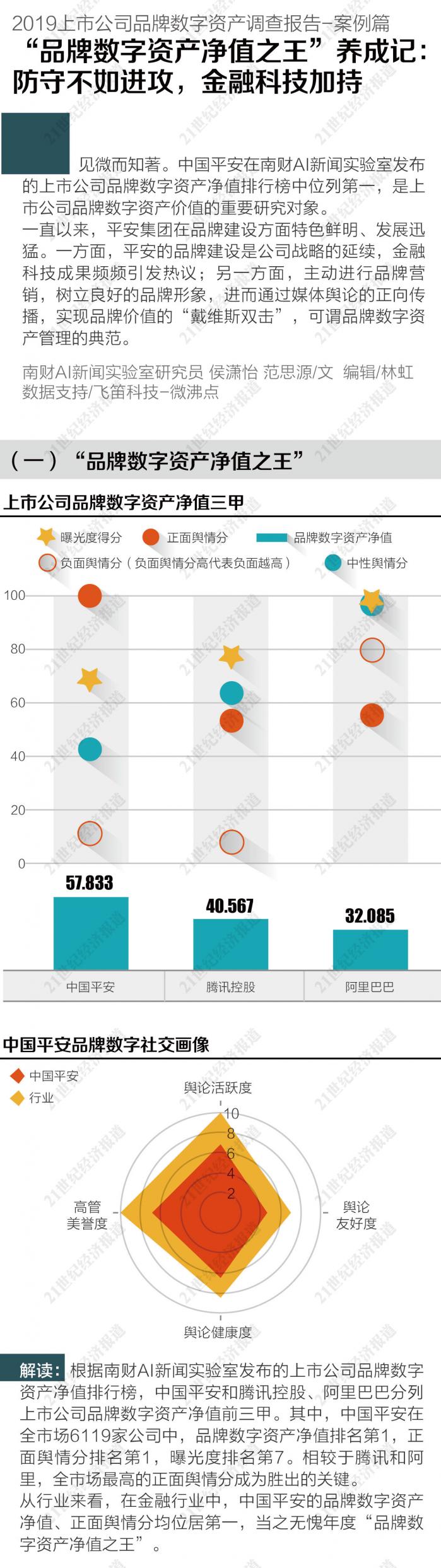 在南方财经AI新闻实验室2019年12月5日发布的《2019上市公司数字品牌资产价值调查报告》中,中国平安的品牌数字资产净值在全市场综合排名和金融行业细分排名均列第一位。