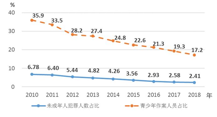 图9 2010—2018年未成年人犯罪人数占比和青少年作案人员占比情况