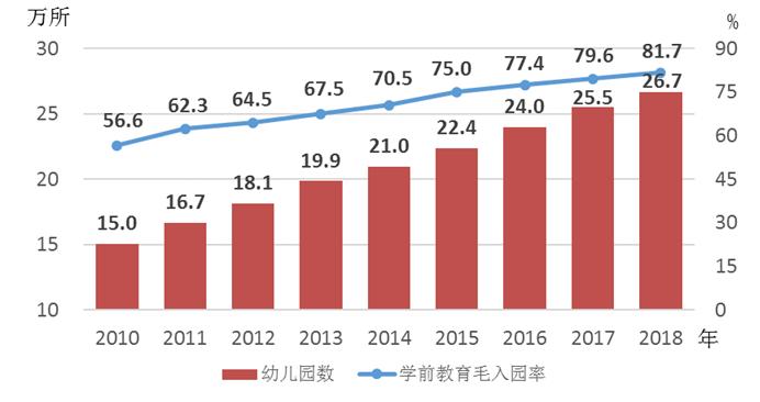 图2 2010—2018年幼儿园数及学前教育毛入园率情况