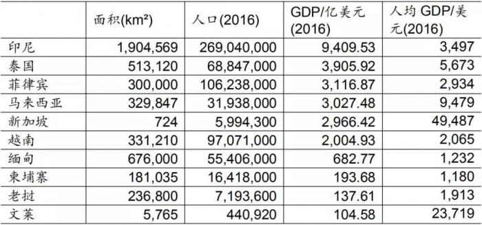 东南亚是全世界第三大人口区域,第六大经济体,根据联合国区域划分标准,东南亚地区包括菲律宾、柬埔寨、老挝、马来西亚、缅甸、泰国、文莱、新加坡、印度尼西亚和越南10国。该区域也是“一带一路”中海上丝绸之路沿线重要部分。东南亚区域总面积约450 万平方公里,可分为中南半岛和马来群岛。2016年,区域总人口6.4 亿,各国国内生产总值合计达到25572 亿美元,人均GDP 约为3996 美元,整体属于发展中经济体,东南亚十国的GDP总量占世界总量约3.4%,经济年均增长率约4.6%,远高于世界平均增长水平,是全球经济发展最为活跃的区域之一。