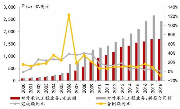 对外承包工程是我国能源基建领域实现海外输出最重要的模式。对外承包工程是指我国的工程承包企业或其他有资质企业以参与投标等方式在境外获得工程合同,承包或分包境外建设和安装等工程项目的经营活动。经过几十年发展,我国已经是国际工程承包大国。2000年4月,国务院转发了当时外经贸部、外交部、国家计委、国家经贸委、财政部、人民银行等六家相关权力机关联合印发的《关于大力发展对外工程承包的意见》,此后我国对外承包工程项目明显发展加速。2015年“一带一路”方案提出后,围绕沿线基础设施和互联互通等需求,我国对外承包工程企业“走出去”积极性不断提高。2000年我国对外承包工程项目完成额不足100亿美元,而到了2018年已达到1690亿美元,18年间增长近20倍,年均复合增速近20%。2018年对外承包工程新签合同额超过2400亿美元,18年的时间里,也实现了年均15%以上的增长。近年来,全球经济增长放缓、国际贸易保护主义抬头、国际工程市场总体萎缩,尽管我国企业仍保持着较高积极性,但从新签订单和合同完成情况来看,增速也明显放缓。