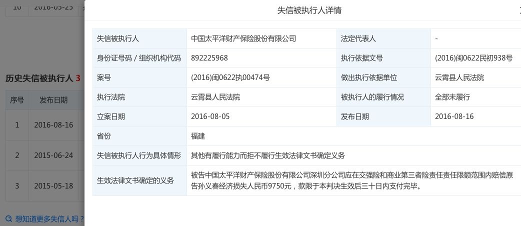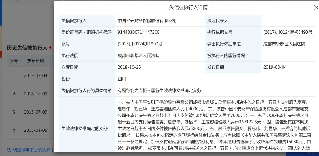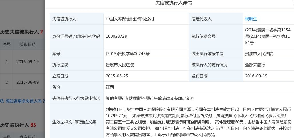 这并非保险公司被纳入“失信被执行人”首例。以国内几家大型险企为例,公开信息显示,它们都有过失信被执行人历史记录,不过都是早几年的记录,今年还未出现过。