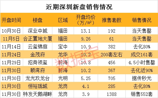 10月30日,深业中城开盘,2794批客户抢192套房,备案均价13.1万/平,去化率100%;