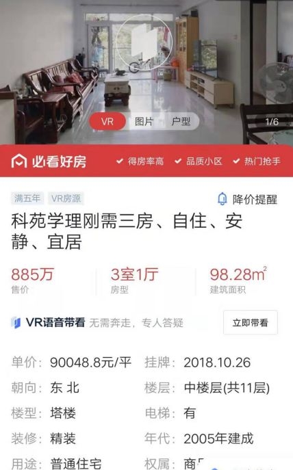 而笔者进入贝壳找房APP中查询发现,科苑学里的一套98平单位,如今挂牌价已达到885万元,挂牌日期为去年10月26日,朝向为东北。