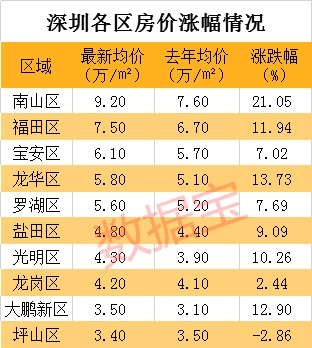 在新盘快速去化的同时,深圳二手房也出现火热迹象,涨价、返价现象有所蔓延。贝壳数据显示,目前均价最高的是南山区,达9.2万/平,可谓是深圳购买力最强地区,去年到今年的涨幅21.05%;其次是龙华,涨幅17.65%;第三是光明新区,涨幅16.13%。