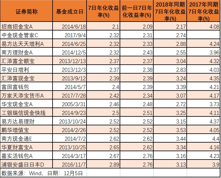 回顾过去两年,当前接入余额宝和零钱通的46只货币基金同期表现均不错,2017年12月5日的7日年化平均收益率为4.04%,2018年同期则是2.81%。然而至今年同期,却只有2.44%,不仅整体破3%,且超30只的7日年化收益率低于2.5%,要知道去年同期7日年化收益率低于2.5%的仅有2只。此外,12月4日收益数据表现令人忧虑,中银薪钱包、景顺长城货币A和招商招金宝A三只产品当日七日年化收益率均不超过2.1%。