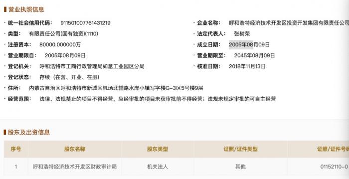工商登记信息显示,呼经开成立于2005年8月,其股东为呼和浩特经济技术开发区财政审计局。
