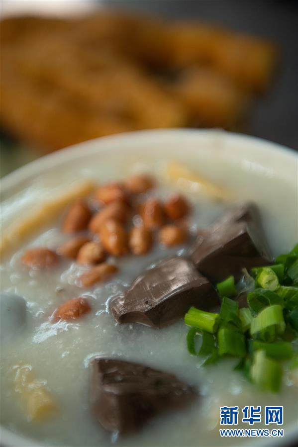 澳门“雄记生滚粥”的艇仔粥(11月19日摄)。位于澳门草堆街女娲庙前的“雄记生滚粥”是当地居民喜欢光顾的一家早餐店,粤式及第粥、艇仔粥、牛肉猪润粥、瘦肉皮蛋粥等即点即煮,亦可另加猪红,鲜味十足。 新华社记者 张金加 摄