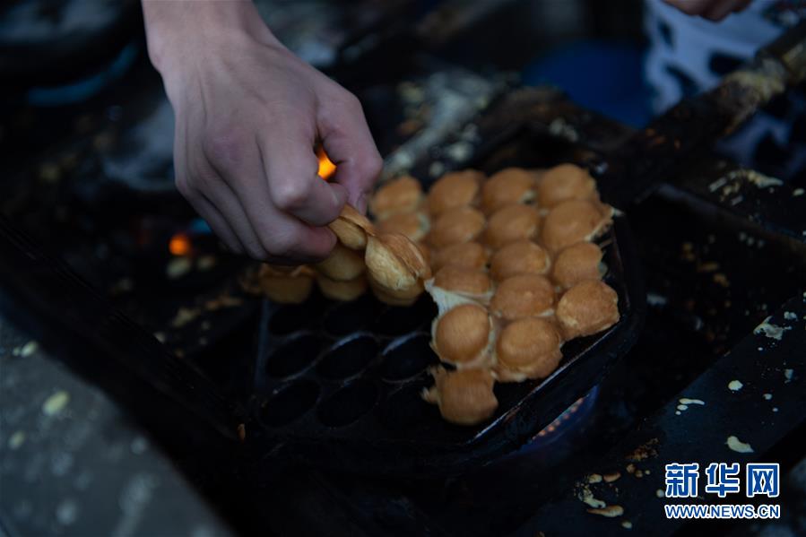 11月20日在位于澳门大堂斜巷的“兴二”车仔档拍摄的制作中的鸡蛋仔。新鲜出炉的鸡蛋仔蛋味浓郁、香脆可口,可以选择加酱料、炼奶或花生酱。在美食林立的澳门,鸡蛋仔是澳门特色小食中的经典代表。 新华社记者 张金加 摄