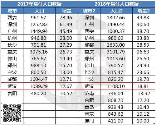 据城市进化论,2017年,有12个城市的常住人口增量超过10万,其中超过20万的有6个,这当中没有武汉;2018年,常住人口增量超过10万的城市有16个,超过20万的增加到9个,武汉仍旧不在此列。