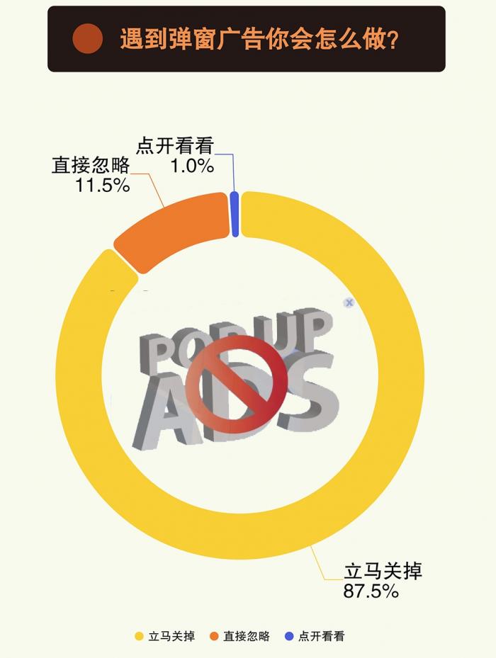 据21世纪经济报道发起的调研显示,99%的网友看到弹窗广告会马上关闭或直接忽略,只有1%的网友会点开看看。