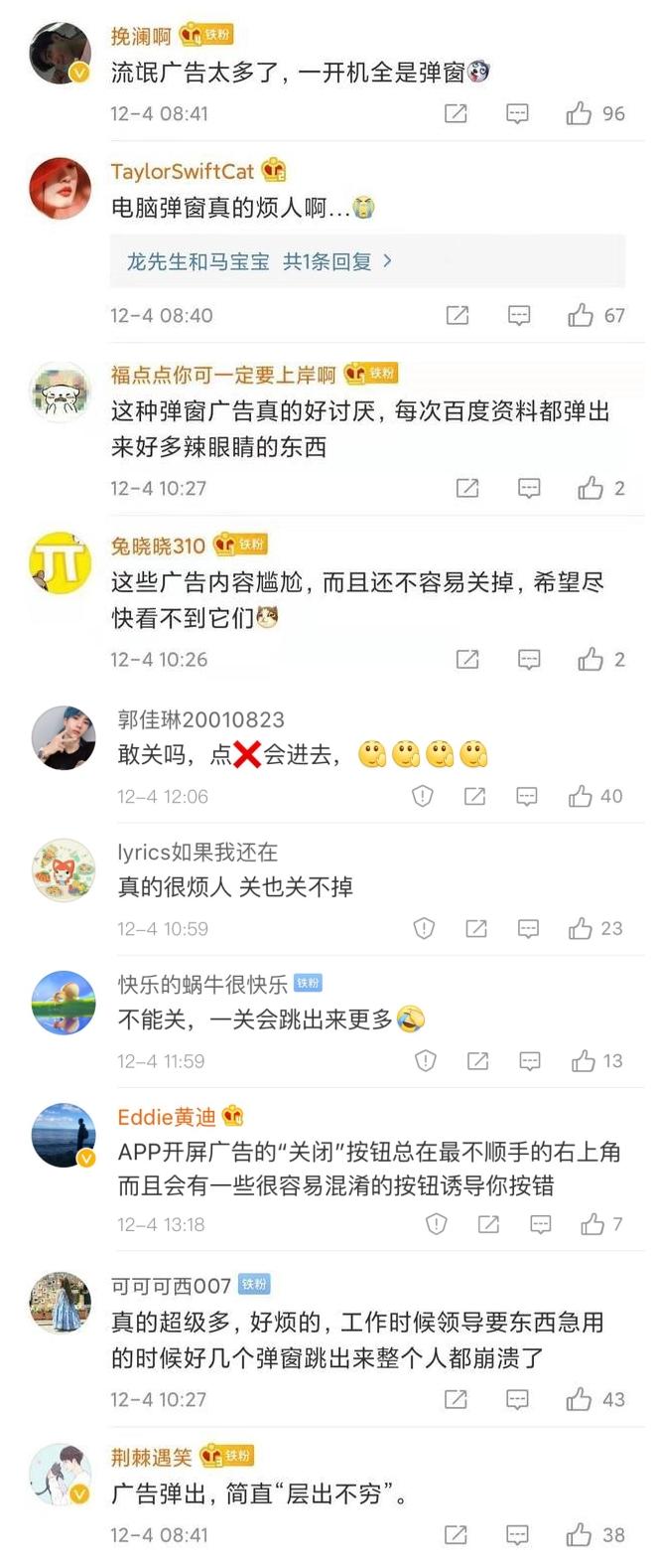 也有网友表示:想关都关不掉,一个接一个。“关闭标志特别小,不明显,有时候明明点击了关闭,结果却变成了浏览广告,令人不胜其烦。”