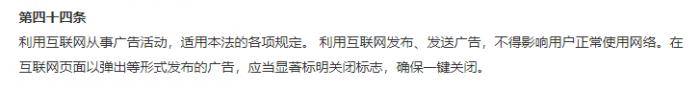 江苏天煦律师事务所张赛律师表示,弹窗广告首先违反了《广告法》的相关规定:“利用互联网发布、发送广告,不得影响用户正常使用网络,在互联网页面以弹出等形式发布的广告,应当显著标明关闭标志,确保一键关闭。”