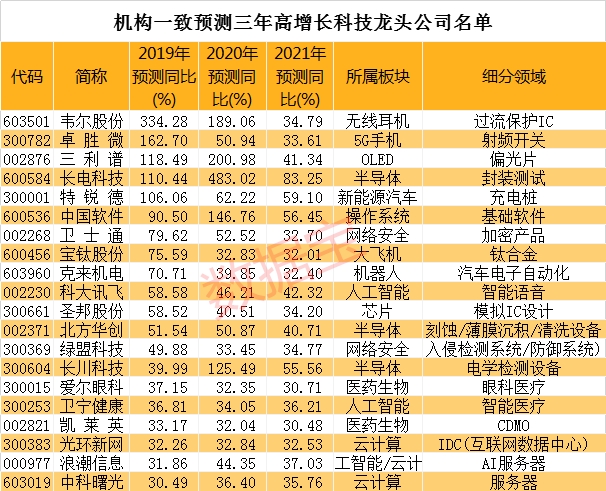 根据5家以上机构一致预测数据,2019年、2020年及2021年三年净利润预测增幅均超过30%的公司,共计20家,包括电源管理类芯片龙头韦尔股份、射频前端芯片龙头卓胜微、智能语音龙头科大讯飞、眼科医疗龙头爱尔眼科、智能医疗龙头卫宁健康等。三年内净利润增幅均值最高的是长电科技,平均预测增速高达225.57%,该公司是公司全球知名的集成电路封装测试企业。