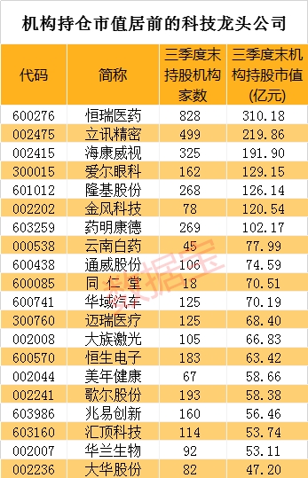 7家科技龙头公司获五大机构持仓市值超百亿元,分别是恒瑞医药、立讯精密、海康威视、爱尔眼科、隆基股份、金风科技、药明康德。创新药行业龙头公司恒瑞医药获机构持仓市值达到310亿元排在首位,精密制造龙头公司立讯精密获机构持仓市值220亿元,智能安防行业龙头海康威视机构持仓市值192亿元。