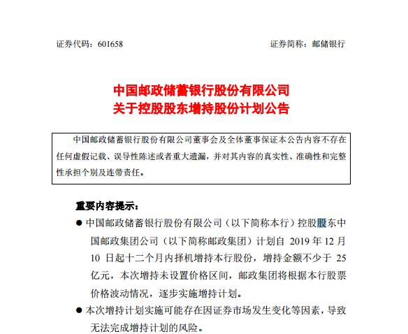 此次,邮储银行(601658)为上市做足了准备。周日晚间邮储银行发布公告称,公司股票将于12月10日在上交所上市。同时,控股股东邮政集团计划增持股票,金额不低于25亿元,加上近43亿元的“绿鞋”资金,这意味着邮储银行上市之初就有68亿资金护盘。