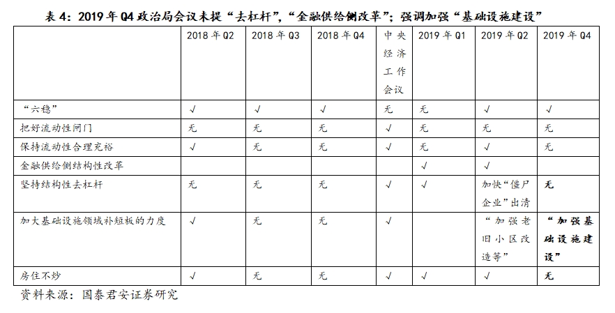 12月4日召开的党外人士座谈会,习近平总书记强调,“要对照全面建成小康社会目标任务,着力抓重点、补短板、强弱项,坚持问题导向、目标导向、结果导向,加强各部门和各项政策的协调配合”。2018年Q4、2019年Q4的政治局会议都强调了“小康目标”(表1)。