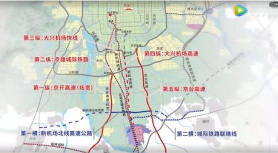 大兴机场具备连接雄安新区和北京城市副中心的区位优势,拥有“五纵两横一联络”发达的交通网络——北京大兴国际机场高速公路、轨道交通新机场线、北京-台北高速(北京段)、北京—开封高速(北京段)、北京-雄安城际铁路(北京段)、城际铁路联络线、北京大兴国际机场北线高速等等。