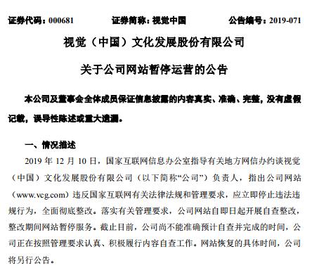 12月10日,视觉中国晚间公告称,落实有关管理要求,公司网站自即日起开展自查整改,整改期间网站暂停服务。截止目前,公司尚不能准确预计自查并完成的时间,公司正在按照管理要求认真、积极履行内容自查工作。网站恢复的具体时间,公司将另行公告。