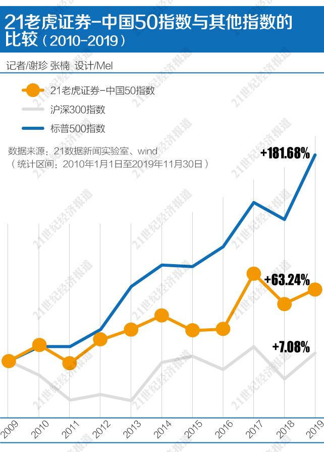 截至2019年11月30日,“21老虎证券-中国 50 指数”净值为 1084.13,相比年初增长 8.41%。21数据新闻实验室复盘近十年数据发现,指数复合回报率为5.02%,累计回报率达 63.24%。这一数据几乎是同期沪深300指数总回报率(7.08%)的9倍,不过与标普500指数的181.68%相比仍有一定差距。