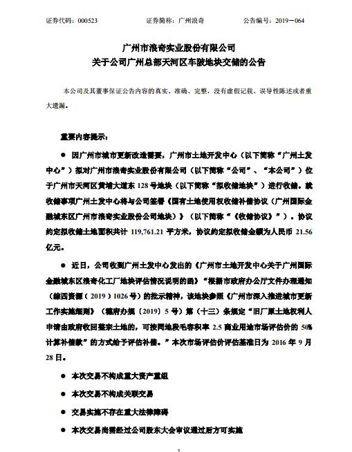广州浪奇表示,本次土地收储事项有利于盘活公司现有资产,优化资产结构,符合公司的长远发展目标。公司已按要求完成生产基地的转移工作,不再在拟收储地块内进行生产制造,故本次土地收储不会对公司正常的生产经营产生重大影响。