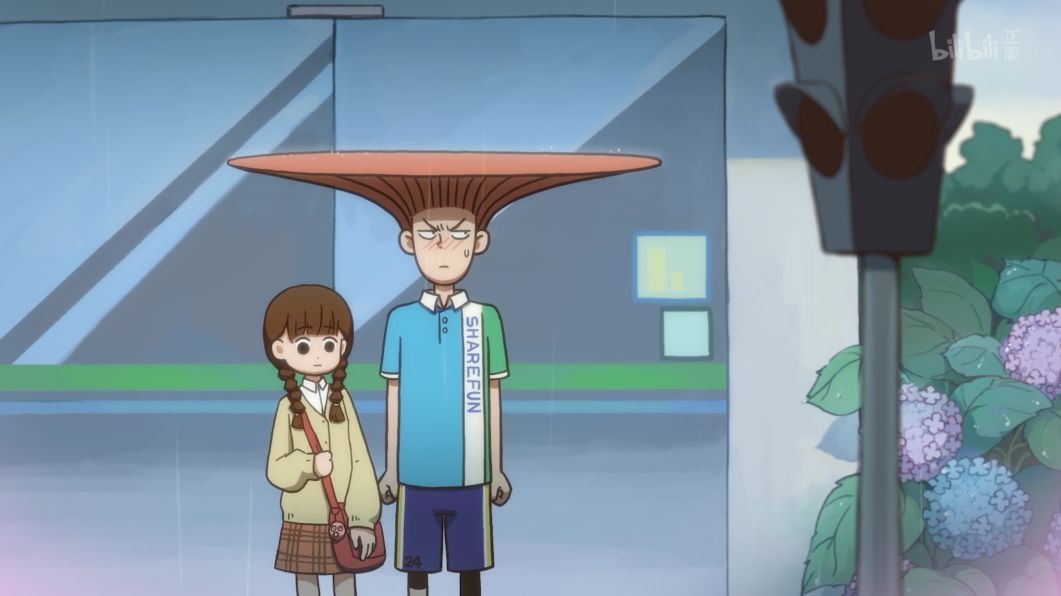 #为了能跟喜欢的便利店女生搭讪,春风一郎特意去做伍六七的理发店做了一个发型,意外地发现可以用来给心爱的女生遮雨。