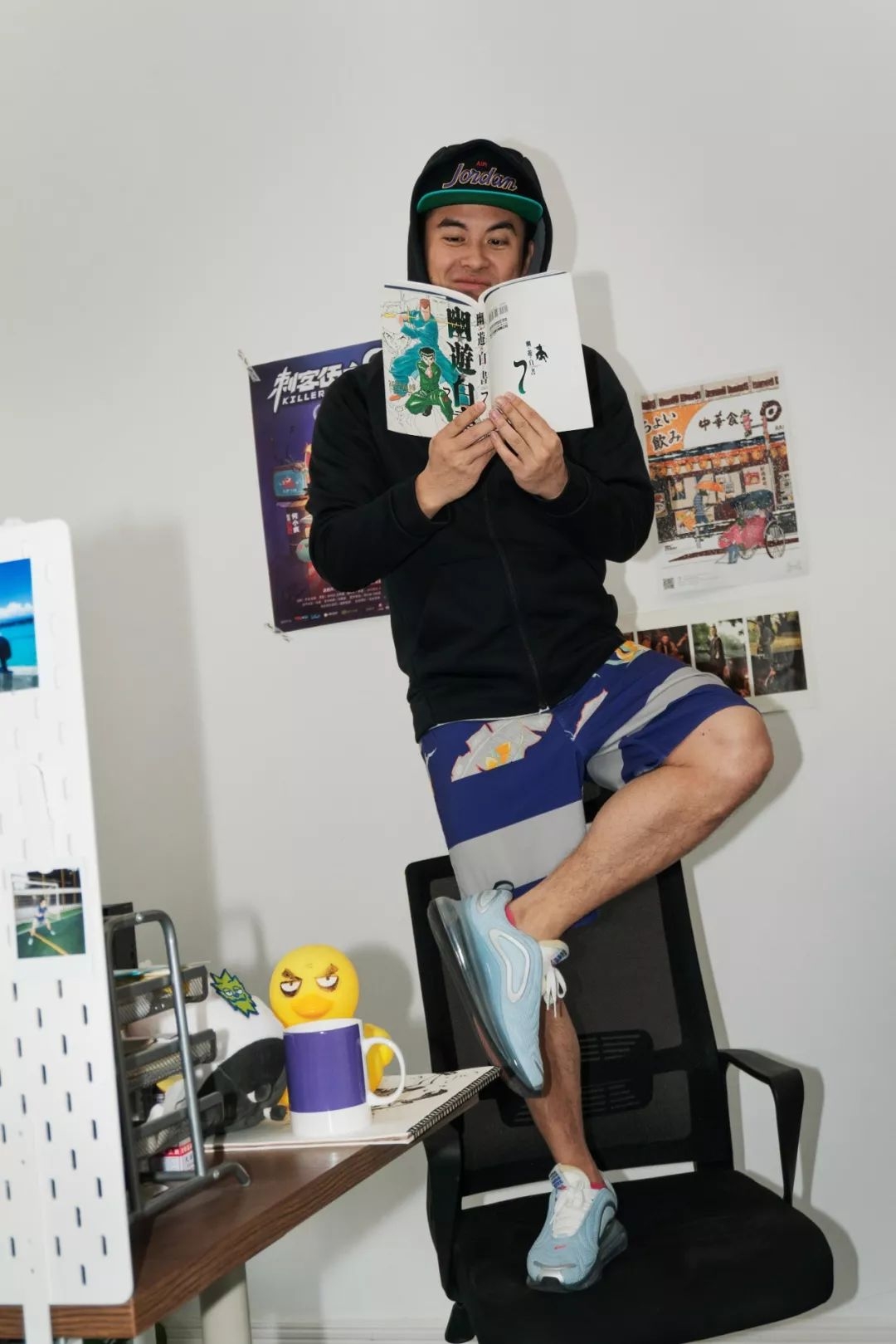 #何小疯最近在看漫画《幽游白书》,这是他小时候最喜欢的漫画之一,墙上贴着《伍六七》海报和《刺客聂隐娘》的剧照。