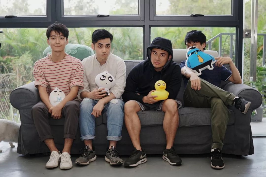 #图片人物左起:原画师杨泽卿,分镜师陈嘉傑,导演何小疯,原画&op和Ed作曲侯俊杰。除了最右边的鸡大保,他们手里拿着的都是变身的伍六七。
