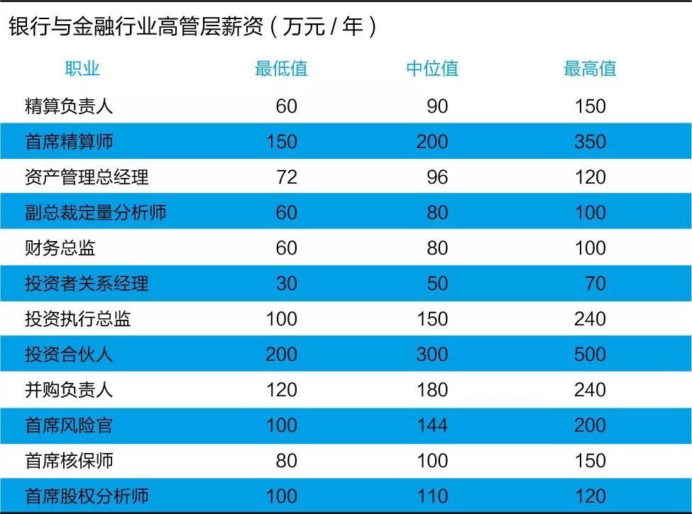 招聘顾问公司 Michael Page 近期发布《薪酬标准报告》,公布了北京15个行业不同级别岗位的薪资,可以一窥领导们到底能拿多少钱:银行与金融行业的高薪岗位最多,首席精算师、投资总监、并购负责人都能拿到超百万年薪;办公室行政行业的高薪人士最少,高级秘书一年最多只能拿到36万元。