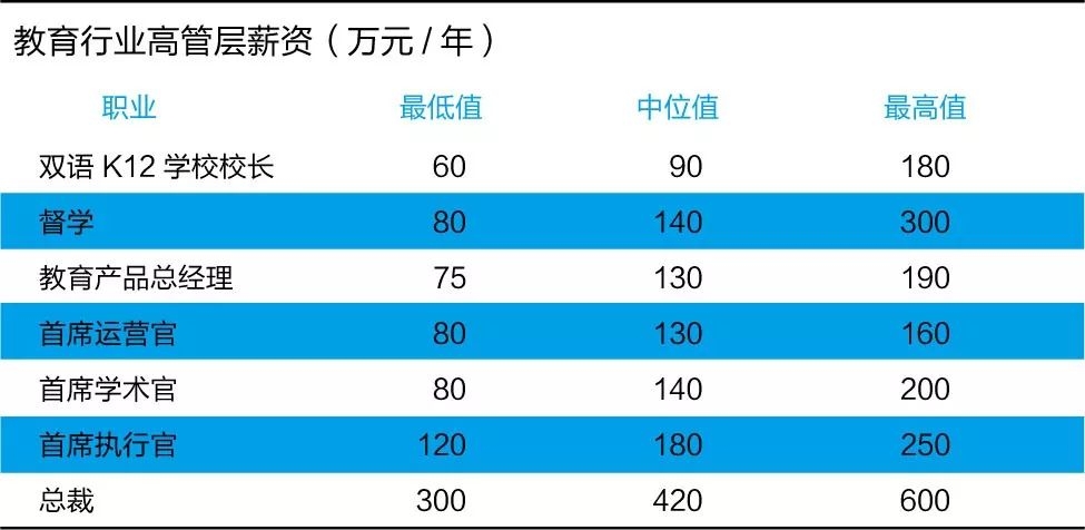 在教育行业,双语 K12 学校校长一年最高能拿到180万元,与之相比,督学的薪酬数字略胜一筹,最高能拿到300万元/年。