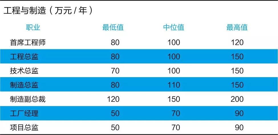 作为传统行业,工程与制造行业的薪资水平略差,工厂经理的年薪最多90万元/年。