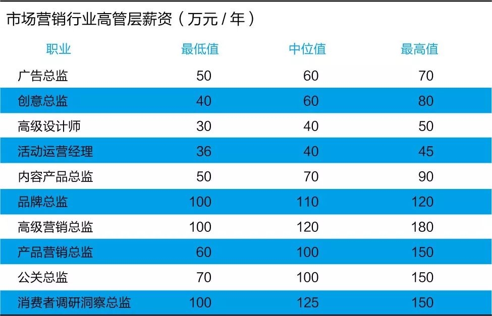 在市场营销行业,高级设计师最多只能拿50万元的年薪,做活动运营的高管们更惨,最高45万元/年。公关总监的薪酬水平要高很多,中位数为100万元/年。