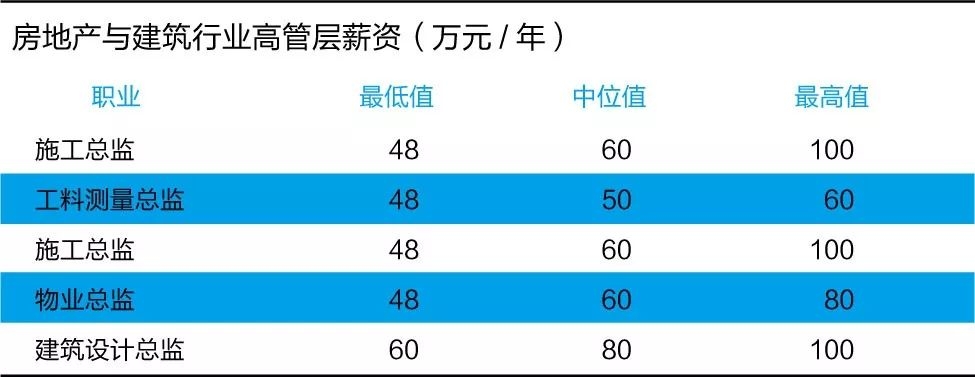 房地产与建筑行业的薪资水平低于其他行业。施工总监和建筑设计总监最高能拿到100万元/年。