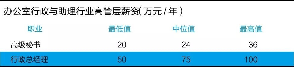 由于供过于求,行政人员的工资普遍偏低。一名高级秘书薪酬的最高值为36万元/年,行政总经理薪酬的最高值为100万/年。
