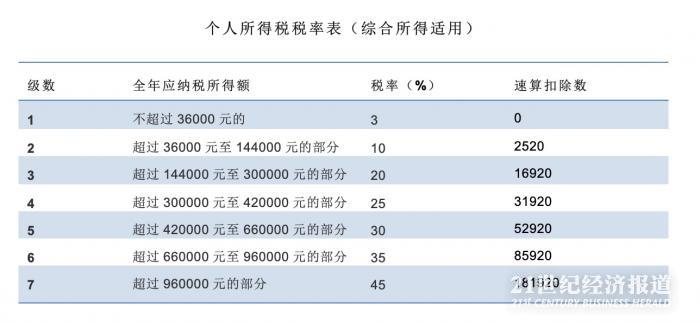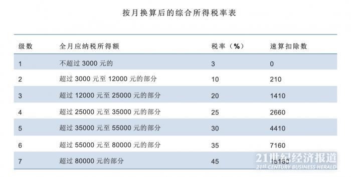 如果将年终奖并入年度收入计税,适用综合所得税率表(如下),