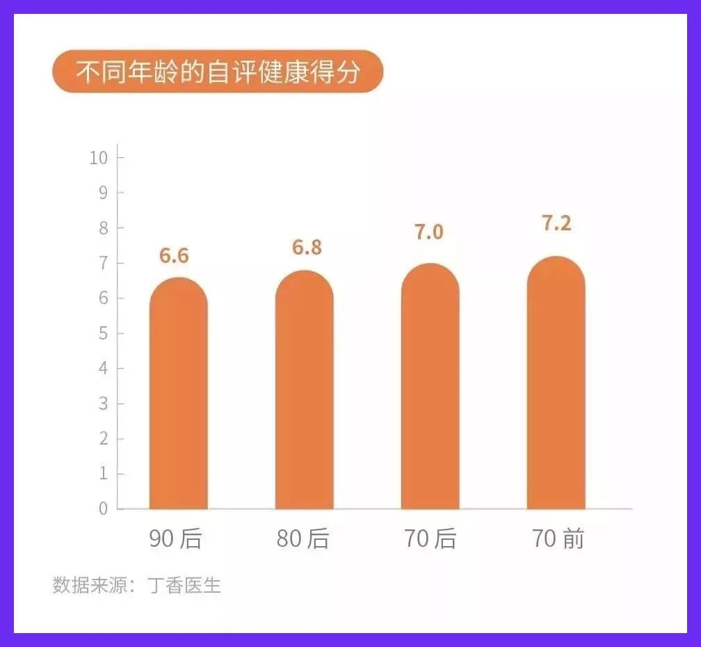 丁香园联合《健康报》社发布的《2019国民健康洞察报告》显示,在70前、70后、80后、90后四个年龄段的人群中,90后的健康自评分最低。90后更愿意了解正确的健康知识,对于辟谣类内容更为偏爱,他们对于健康思想的接受、健康知识的渴求和健康要求都相对较高。
