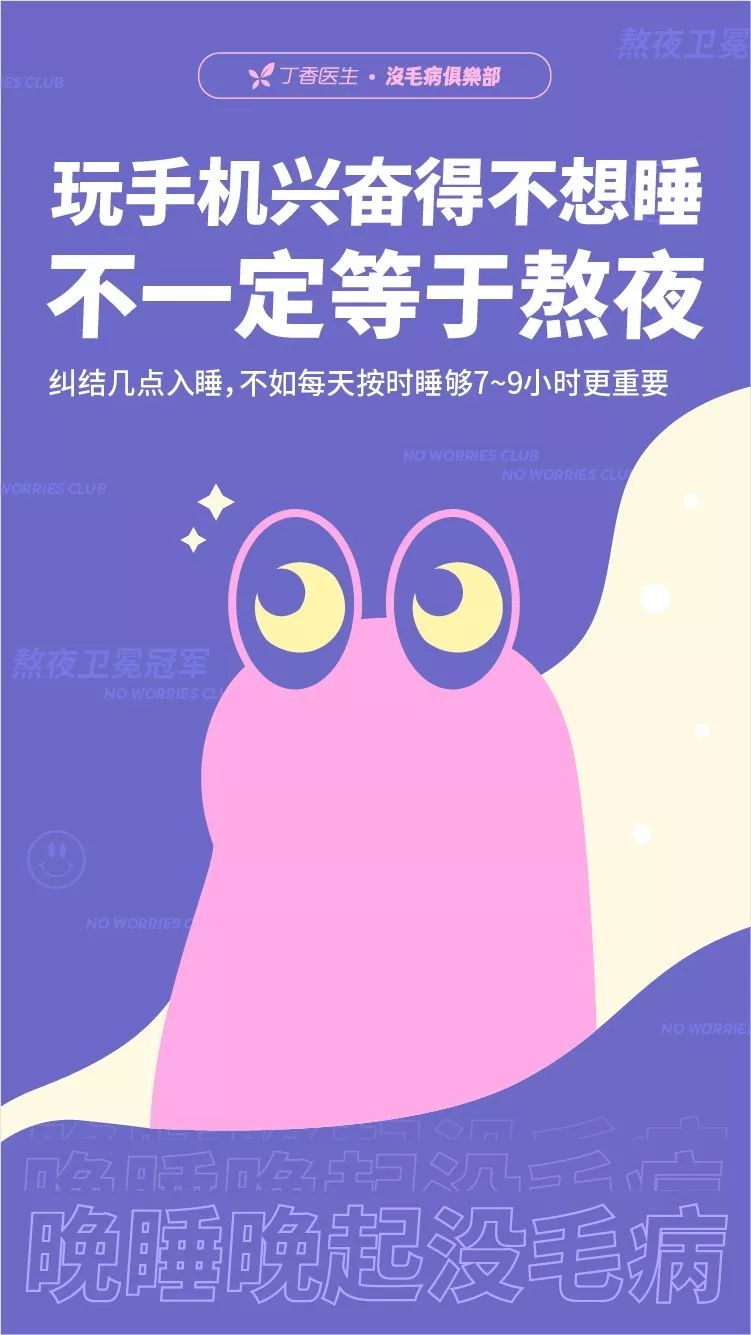 从医学来看,稍微晚点睡也没毛病,保证每天按时睡够7~9小时更重要。另外可以中午休息20分钟,最好能躺会,趴着也行,别压眼、别压脸就没毛病。科学的健康知识通过打破误区帮人们消除了某些不必要的焦虑。Don't worry ,睡觉就是为了休息,没有KPI压力 。快乐也不一定就会“有毛病”。我们要健康,要没毛病的身体,却不必丢掉快乐的自己。